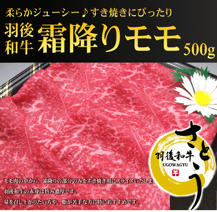 ![]() | 秋田県産羽後和牛 霜降りモモすき焼き用 500g 秋田牛羽後牛 価格:5508円 |